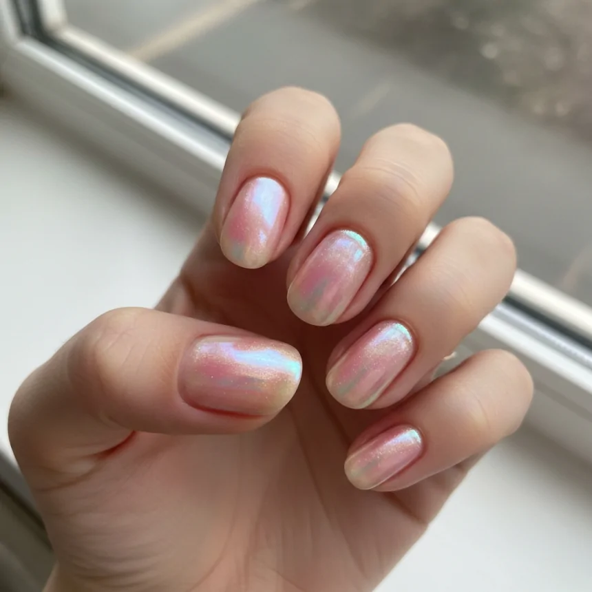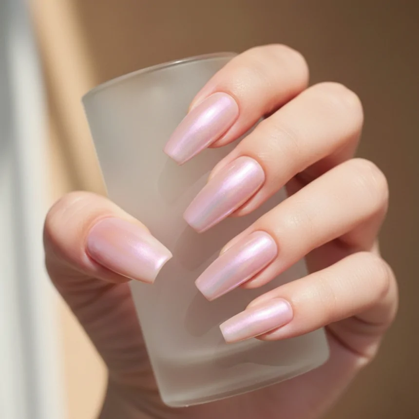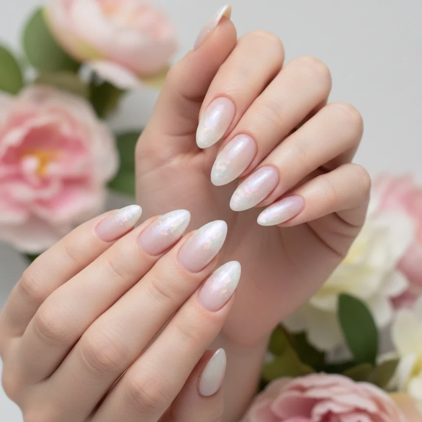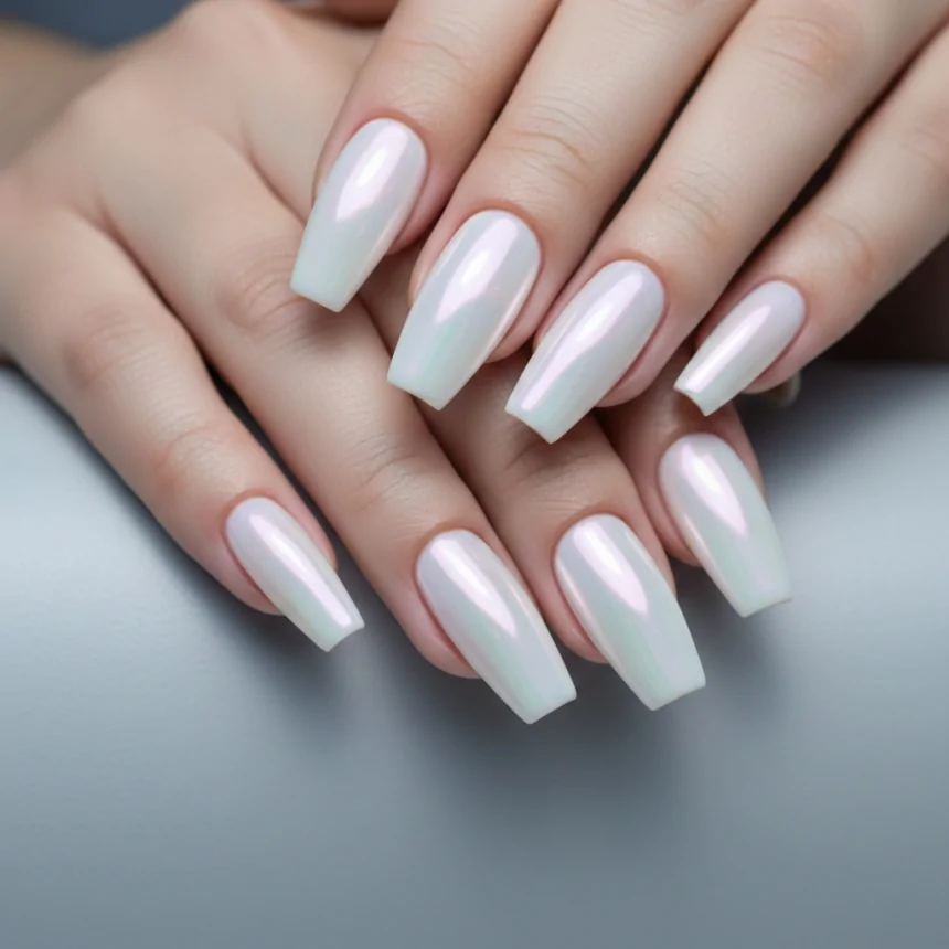 For a delicate, angelic look, sheer white shimmer is a beautiful choice. It adds a subtle glow and depth to your prom nails without being heavy, making them appear ethereal and clean. Perfect for a classic or romantic gown.