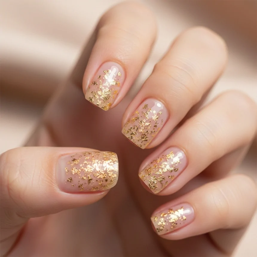 This design uses abstract gold foil to add an artistic, luxurious touch without being heavy. The scattered flakes create visual interest while maintaining a clean, minimal feel. It's a sophisticated way to add sparkle to your prom nails, simply.