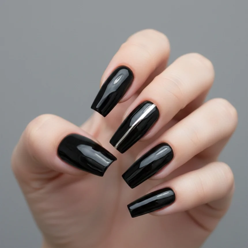 Add a modern edge to your prom nails with a chic metallic stripe. This design uses a silver line against black for a striking, clean contrast. It’s bold, geometric, and offers a contemporary take on classic colors.