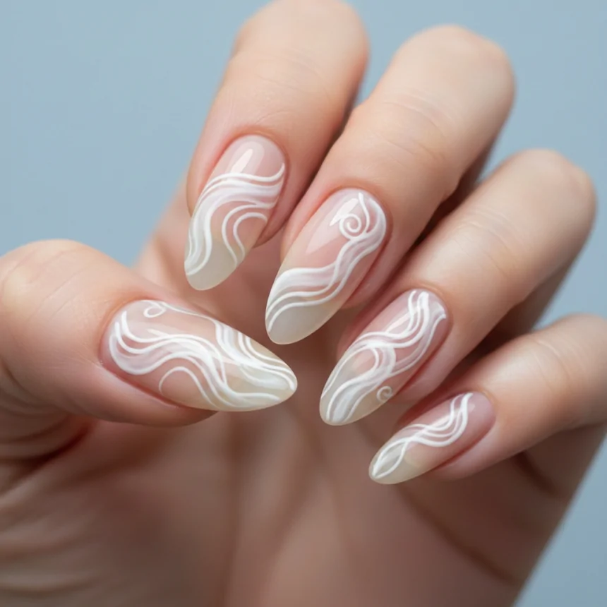 For a unique and artistic flair, clear nails with white swirls offer a sophisticated and clean aesthetic. This design uses negative space beautifully, making it modern and eye-catching without being too busy.